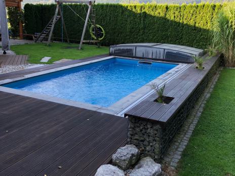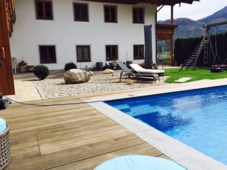 Eine Holzterrasse lädt zum Feiern, Spielen oder einfach nur Relaxen ein.